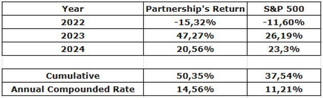 The S&P 500 returned 23.3% in 2024. The index’s return since the partnership began has been 37.54%, or 11.2% per annum.