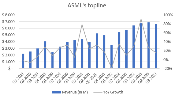 Revenue for the quarter came in at 6.67bn, growing 15.5% yearly and declining 3% sequentially. The compound annual growth rate for ASML’s topline sits at 19.2% for the past five years. Even though deceleration appears to be massive, the are two factors playing here: