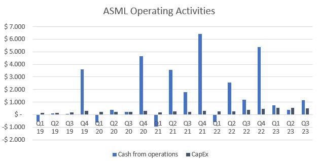 Turning our attention to the cash flow statement, ASML brought in 1.12bn in cash from operating activities, down 3.6% year on year. On the other hand, capital expenditure amounted to 501M this past quarter, very in line with Q1 and Q2, though an increase of almost 50% over the comparable quarter, affecting the resulting free cash flow. Given how much seasonality there is embedded in this business’ cash flow, quarterly numbers tell fairly little.