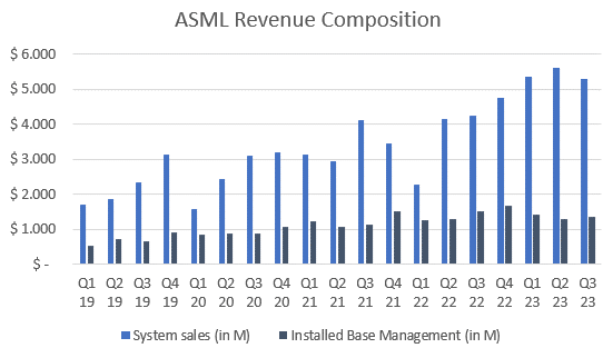 In this last quarter, 80% of the company’s revenue came from selling lithography machines. As everything ASML-financial-related, the share of revenue is volatile. Although system sales appear to have been taking share of total revenue, at least since early 2019, their total share of revenue oscillates between 65-80%.