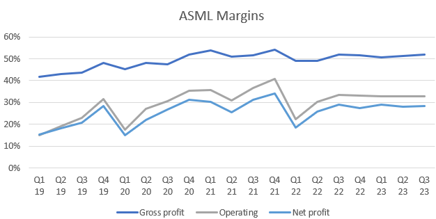 However, it is worth exposing the superb growth ASML’s booking experienced during 2020-22, having risen by almost 300%. Again, spikes like these, in many cases, simply pulls demand forward, for which short-term new demand can experience some weakness. In any case, backlog is still strong, and it has really helped ASML endure this tough environment.