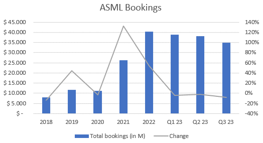 Total bookings is a very insightful variable since it allow us to infer what companies are foreseeing and, from ASML’s perspective, it offers a window into its future topline. Moreover, it sort of shows how resilient could the subsequent quarters for the company be, which, in a downturn cycle for the semi-industry, can prove useful.