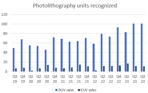 In addition to the aforementioned categorization, system sales revenue can also be split into two main products, deep ultraviolet (DUV), and extreme ultraviolet machines (EUV). During Q3, DUV sales were 101, while 11 EUVs were sold.