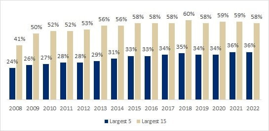 This is something that, throughout the years, has manifested itself on a broad basis within the staffing industry. The following chart, illustrating the percentage of business that’s captured by the largest 5 and 15 companies, suggests the industry has been tending towards consolidation.