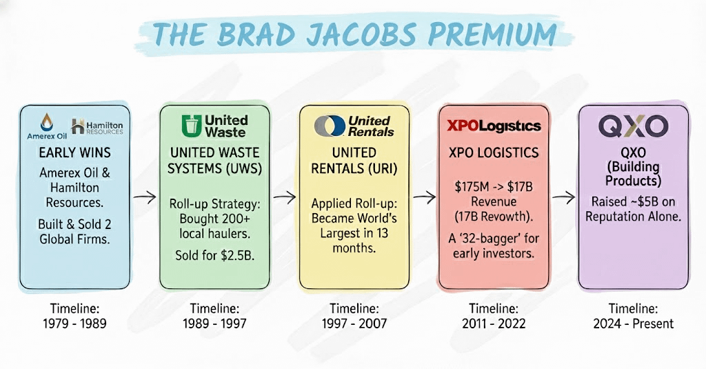 Brad Jacobs is an extreme version of this idea. He has consistently shown his ability as an operator and the market is thus able to sit back and trust. In 2024, Jacobs was able to raise $5bn on just a plan. Even though he had identified the target sector, he had no experience or operation in that industry. But the market knew that, no matter what, Brad was able to spot fragmented industries where his skills were applicable.